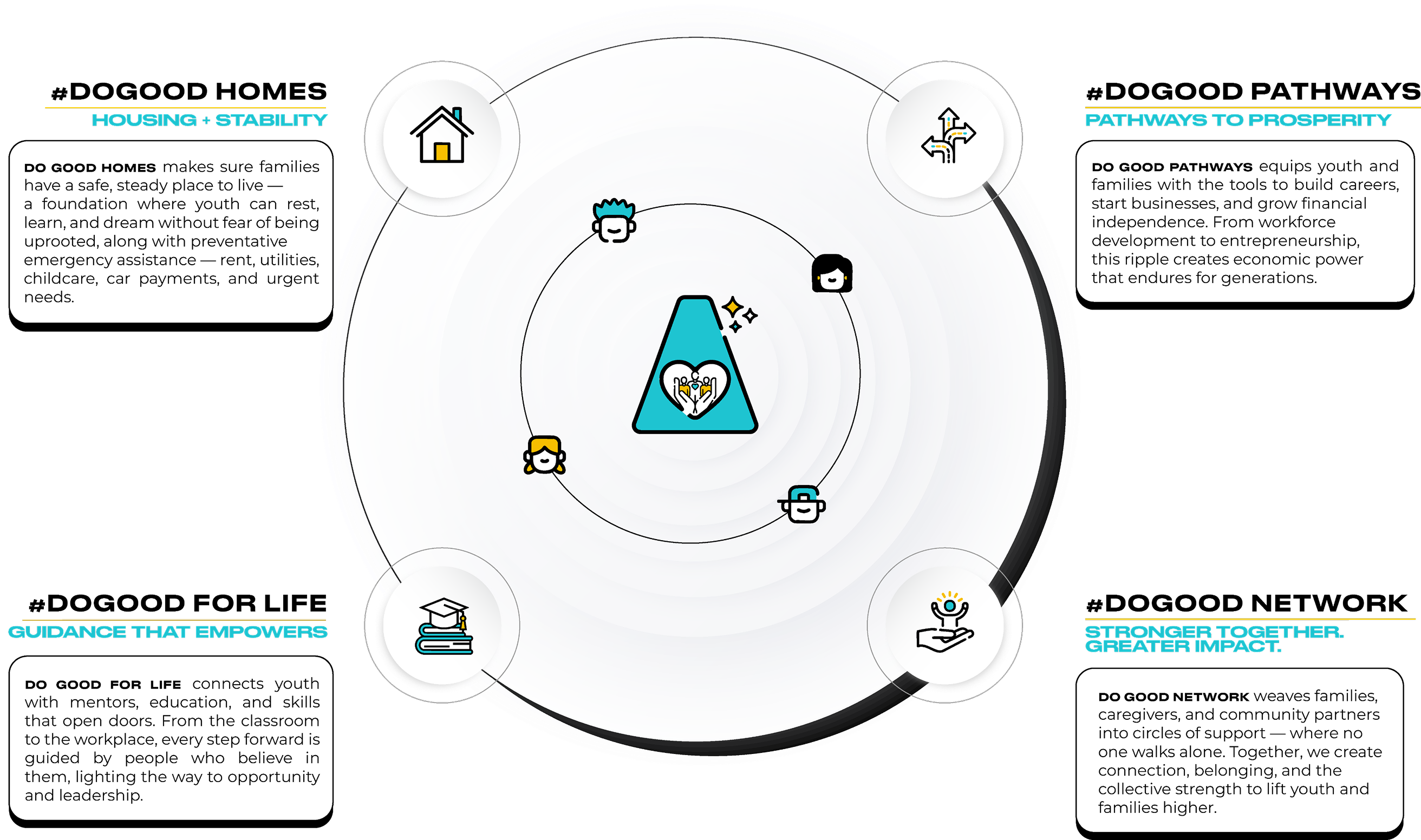 At the Do Good Daniels Family Foundation, we empower youth and families to Be Good. Do Good. Spread Good., by providing relationship-centered programs and an interconnected ecosystem of services. Through housing, economic empowerment, education, and holistic care, we equip individuals and communities to thrive.
